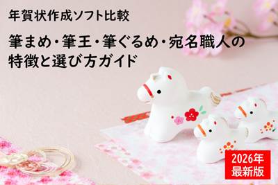 2026年版”年賀状作成ソフト「筆まめ」「筆王」「筆ぐるめ」「宛名職人」を徹底比較。素材数・AI機能・プラン価格までまとめ、使い勝手とコスパ重視であなたに最適なソフトを選ぶガイド。