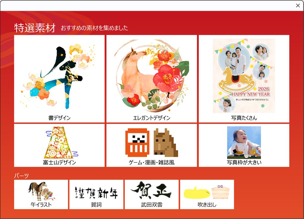 3ステップで完成する特急デザイナーや、クリックだけでパーツをどんどん変更できてたのしい年賀状デザインナビ、初心者向けでシンプルなはじめてモードを搭載。自分のスタイルに合った作り方を選べます。